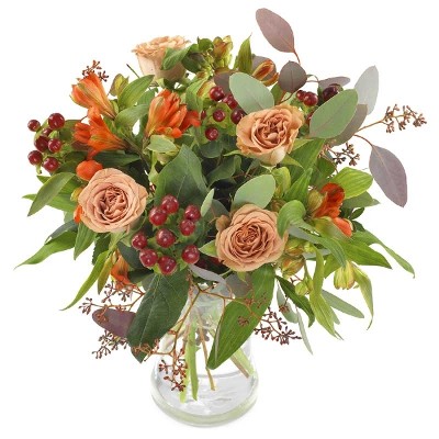 En trendy vinterbukett i myke cappuccinotoner, med blomster som roser, hypericum og livlig oransje alstroemeria. Perfekt til bursdager, viktige jubileer og alt annet du ønsker å feire. Buketten er et eksklusivt blomsterhåndverk, og blomstene er nøye utvalgt for å holde høy kvalitet. Hver bukett er unik og bindes etter sortiment og sesong, men beholder alltid sin farge og form. Buketten leveres av en lokal dekoratør.