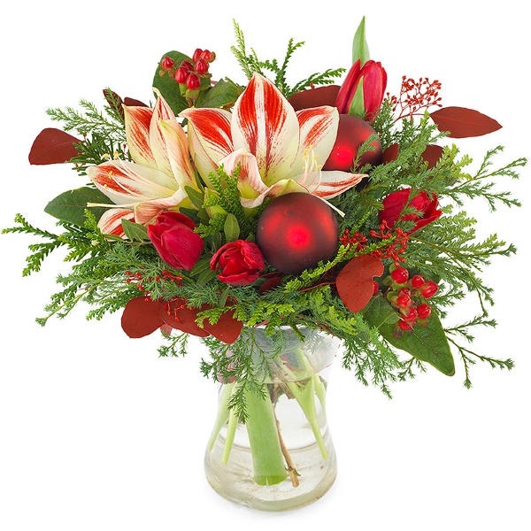 Julebukett med rød og hvit amaryllis, røde tulipaner, rød hypericum og røde dekorative kuler, vakkert bundet med vintergrønt og rød eukalyptus. Perfekt når du vil ønske noen du er glad i en god jul. Buketten er et eksklusivt blomsterhåndverk, og blomstene er nøye utvalgt for å sikre høy kvalitet. Hver bukett er unik og bindes ut fra sortiment og sesong, men beholder alltid sin farge og form. Buketten leveres av en lokal blomsterhandler.