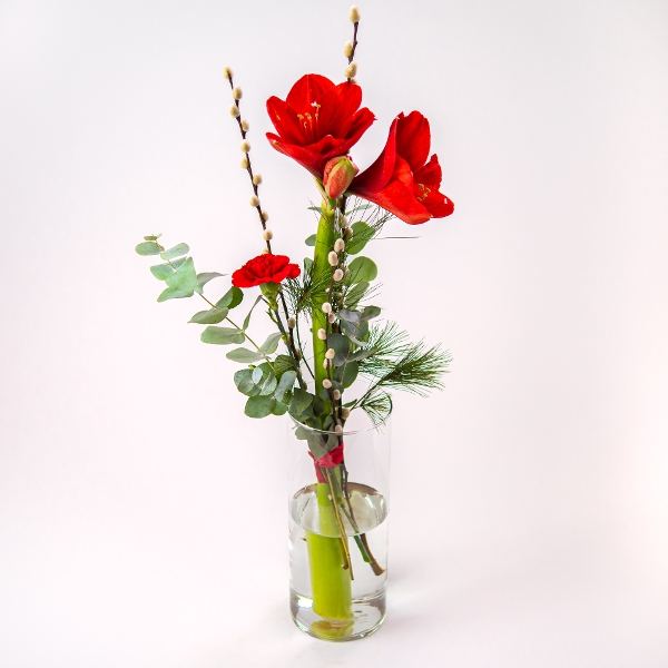 Høy bukett med røde amaryllis og nelliker sammen med vinterens grønne furu. Perfekt når du vil ønske god jul. Buketten er et eksklusivt blomsterhåndverk, og blomstene er nøye utvalgt for å holde høy kvalitet. Hver bukett er unik og bindes ut fra sortiment og sesong, men beholder alltid sin farge og form. Buketten leveres av en lokal dekoratør.