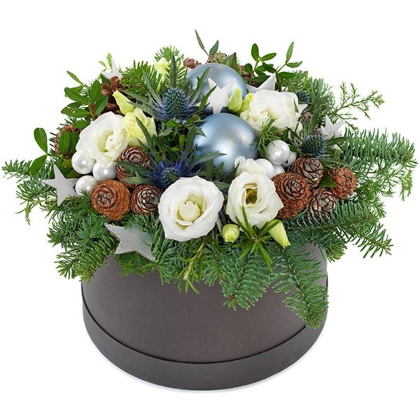 Søt eske fylt med vinterens vakreste blomster og dekorasjoner. Esken inneholder blomster som hvit lisianthus og blå kornblomst, arrangert med vintergrønt. Perfekt når du vil overraske noen med en unik gave som lyser opp i vintermørket. Arrangementet er et eksklusivt blomsterhåndverk, og plantene er nøye utvalgt for å sikre høy kvalitet. Hvert arrangement er unikt og lages ut fra sortiment og sesong, men beholder alltid sin farge og form. Leveres av en lokal blomsterhandler.