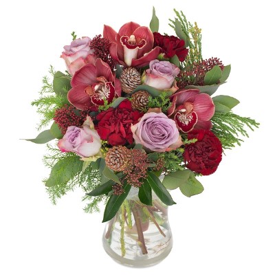 Vakker vinterbukett med blomster som roser, nelliker og skimmia sammen med vinterens grønne. Med sine vinrøde og lilla farger blir denne buketten en uforglemmelig overraskelse. Perfekt for alt du ønsker å feire i vinter. Buketten er et eksklusivt blomsterhåndverk, og blomstene er nøye utvalgt for å holde høy kvalitet. Hver bukett er unik og bindes ut fra sortiment og sesong, men beholder alltid sin farge og form. Buketten leveres av en lokal dekoratør.