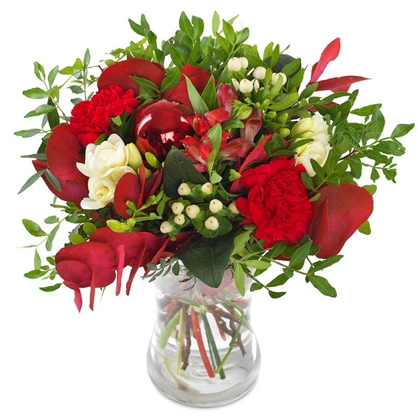 Klassisk julebukett med blomster som røde nelliker og alstroemeria, hvite fresia og hvit hypericum, dekorert med rød eukalyptus, pistasj og glitrende røde julekuler for et festlig uttrykk. Perfekt for alt du vil feire i julen. Buketten er et eksklusivt blomsterhåndverk, og blomstene er nøye utvalgt for å sikre høy kvalitet. Hver bukett er unik og bindes ut fra sortiment og sesong, men beholder alltid sin farge og form. Buketten leveres av en lokal blomsterhandler.
