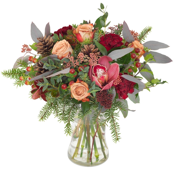 Tidløs vinterbukett med pudderrosa roser og vinrøde innslag. Med blomster som nelliker, hypericum, skimmia og vintergrønt er denne buketten et naturlig valg. Perfekt for alt du vil feire i vinter. Buketten er et eksklusivt blomsterhåndverk, og blomstene er nøye utvalgt for å sikre høy kvalitet. Hver bukett er unik og bindes ut fra sortiment og sesong, men beholder alltid sin farge og form. Buketten leveres av en lokal dekoratør.