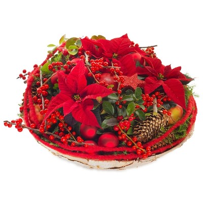 En vakker julegruppe fylt med søte små julestjerner, arrangert på en seng av grønt. I arrangementet finner du sesongblomster som gaulteriabær, ilexbær, vintergrønt og mose. Med dekorative innslag som røde kuler, kongler og epler er det den perfekte julegaven. Arrangementet er et eksklusivt blomsterhåndverk, og plantene er nøye utvalgt for å holde høy kvalitet. Hvert arrangement er unikt og lages ut fra sortiment og sesong – men beholder alltid sin farge og form. Leveres av en lokal blomsterhandler.